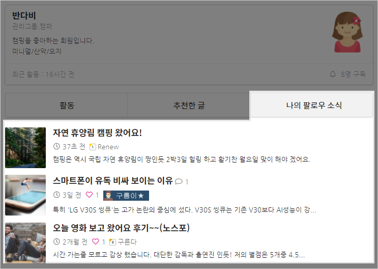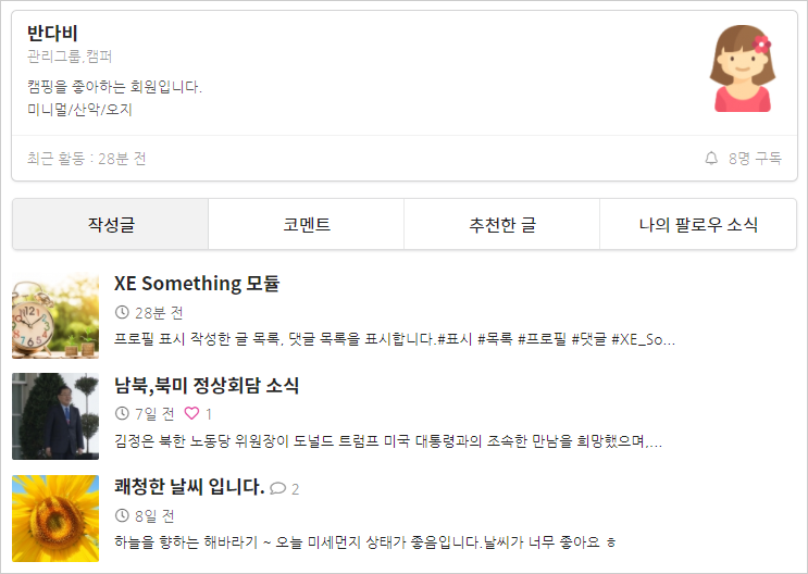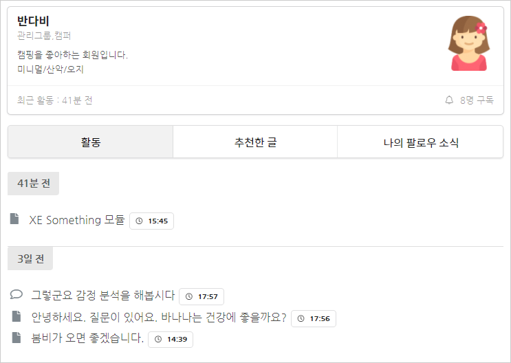 XpressEngine 과 Rhymix 에서 회원의 활동 내역을 출력하는 모듈입니다.